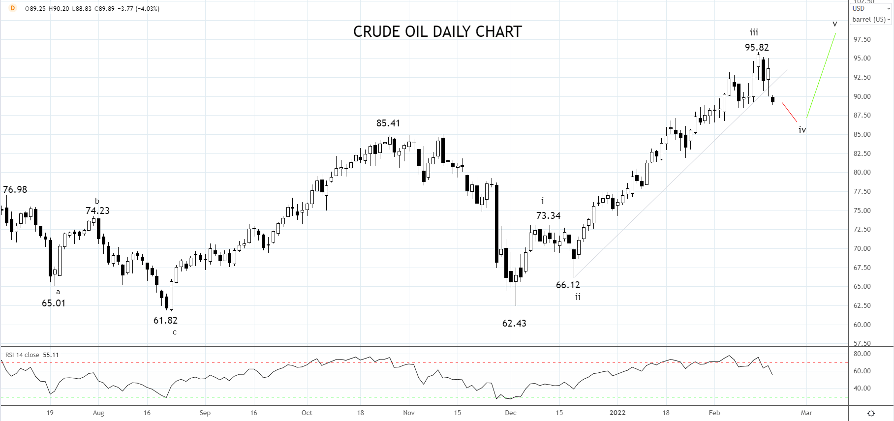目前市况高度不明朗,但如果接下来几天达成核协议,再假设俄乌危机继续降温,油价可能突破近期低点88.50附近,继而扩大当前回调行情,下探10月高点85.40/00一线的支撑。