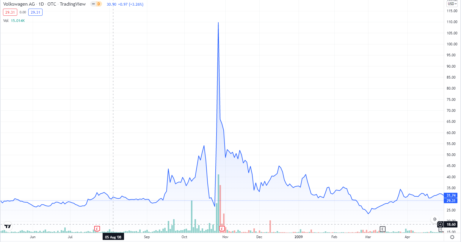 大众汽车(Volkswagen)的股价在2008年全球金融危机期间因为同行保时捷(Porsche)的动作而遭遇空头回补行情。