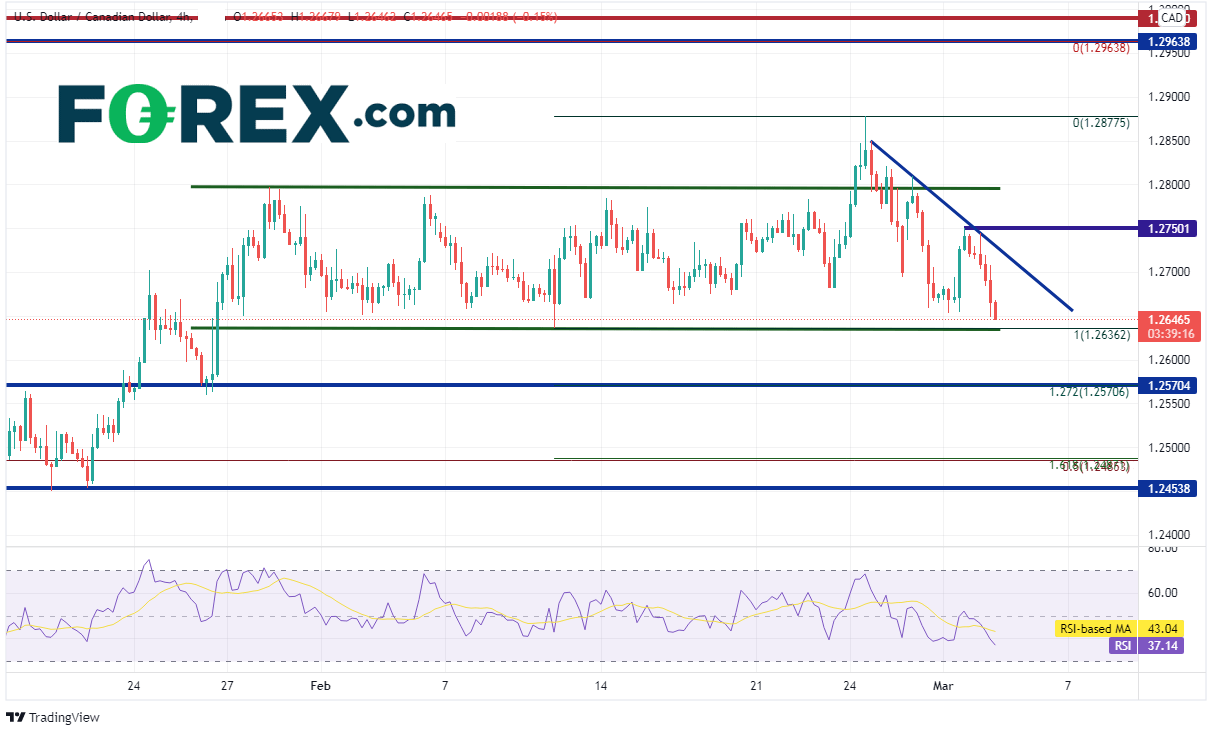 阻力位在今天高点与2月24日以来的下斜趋势线1.2745附近,然后是通道上轨水平趋势线1.2777附近,接着是2月24日高点1.2878。