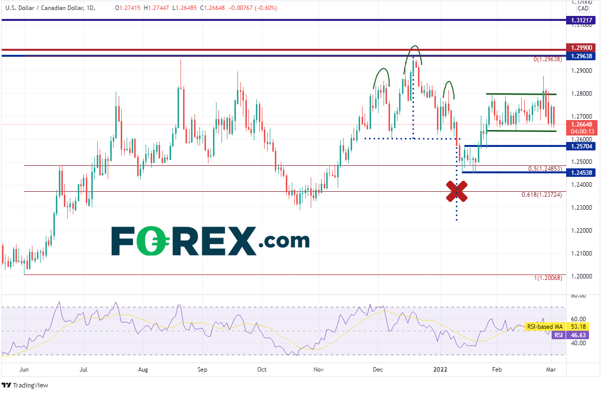 美元/加元日图在1月11日下破了头肩顶形态的颈线后似乎前往此形态目标1.2250附近,但被2021年6月2日低点到12月2日高点行情的50%回档位,即1.2450附近所打断。该货币对随后反弹并且自那以后的大部分时间交投于1.2636 - 1.2777区间。