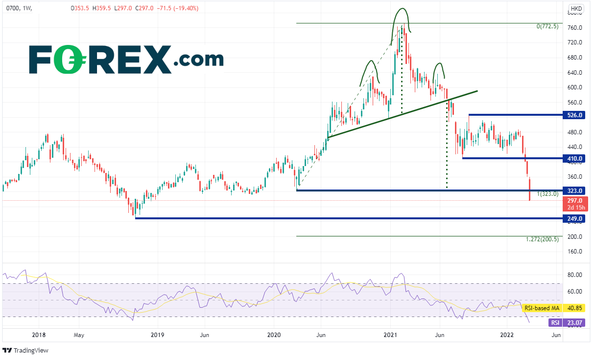 腾讯股价在2021年2月18日创下772.50历史高点,此后不断走弱。2021年5月尝试反击但以失败告终并击穿头肩顶形态的颈线,该形态的目标为颈线下破点加上头部到颈线的高度,本例中在330附近。股价最终于昨天到达前述目标,也跌破由2020年3月低点构成的水平支撑位323。请注意,RSI报在12.03,处于严重超卖状态,暗示价格可能准备回升。