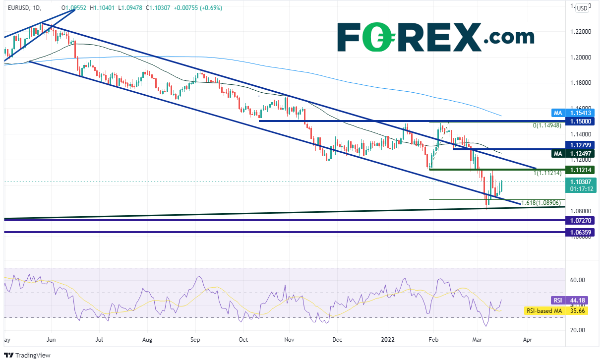 欧元/美元日图有序走低并形成下降通道。2月时一度突破通道但以失败告终,回到通道后考验通道下轨,但止步于1月28日低点到2月10日高点行情的161.8%扩展位,即1.0920附近。预计当前下跌趋势不改,但有空间在通道内先行上涨。上方阻力在3月10日高点兼前低点1.1121附近,然后是通道的上轨下降趋势线1.1210附近。支撑位在通道下轨趋势线1.0890附近,然后是3月7日低点1.0806。