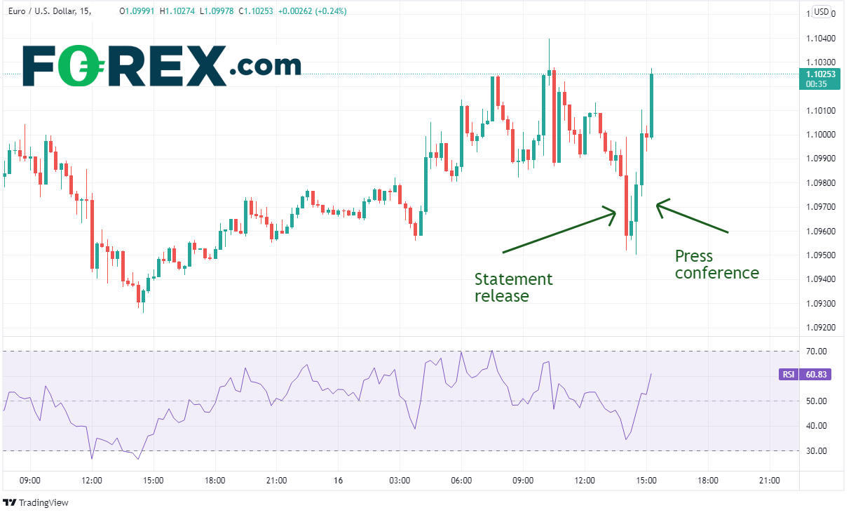在FOMC声明发布与新闻发布会召开前后,欧元/美元的走势极度震荡,原因可能是“见声明沽出、等新闻发布会买进”的行为所致。欧元/美元在1.1000上方不远处构筑高点,在新闻发布会召开前下探1.0950,在发布会之后调头向上回到FOMC声明公布前的高点。