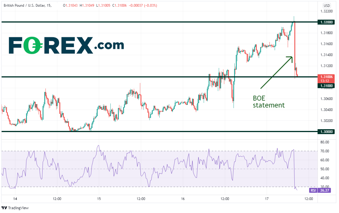 英镑/美元自周二的1.3000缓慢上涨,在上述声明发布之前恰好摸至1.3211。但市场认为声明较温和,趁机“见事实沽出”,推动该货币对几乎在瞬息之间跌至1.3088。