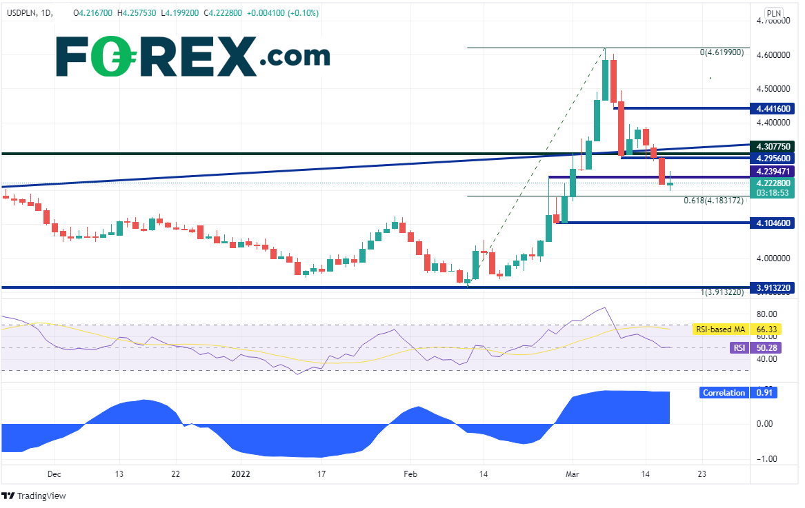 3月以来原油市场极端震荡,西得州油价今天飚升8%以上。油价今天大涨的原因一是IEA担心俄罗斯日原油供应可能减少300万桶,二是俄罗斯与乌克兰之间的和谈被认为已破裂。美元/波兰兹罗提与西得州原油之间存在高度相关性,如果无法交易油价,那么这个货币对可能是不错的替代选择。