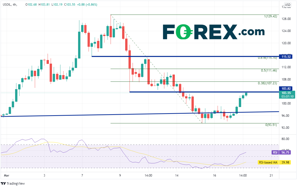 西得州原油在12月2日最低点触及62.78,截至3月7日价格翻倍有余,在俄罗斯入侵乌克兰与随后遭到制裁的推动下摸至131.30。当时RSI严重超买,暗示价格无法持续高位运行。自那以后,有关俄乌有望停火的评论推动油价于周二跌至短线低点93.97。今天油价重拾升势,斩获近8%的涨幅。第一支撑位在周二低点和50天均线合围而成的93.42-93.97区间,然后是2021年12月低点到3月7日高点行情的61.8%回档位89.99,接着是双底形态的颈线85.39附近。