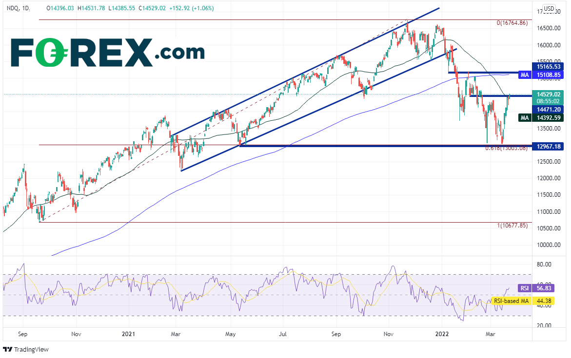 纳斯达克100指数2020年3月以来的涨势于2020年9月止步于10,677.85附近。如上所述,股指高点以来的回撤在周图上止步于一个重要价位,其也为日图重要价位。2020年9月低点到2021年11月高点行情的61.8%回档位在13,003.08。价格已自这些价位回升,目前交投于14500附近的50天均线与水平阻力位所在。