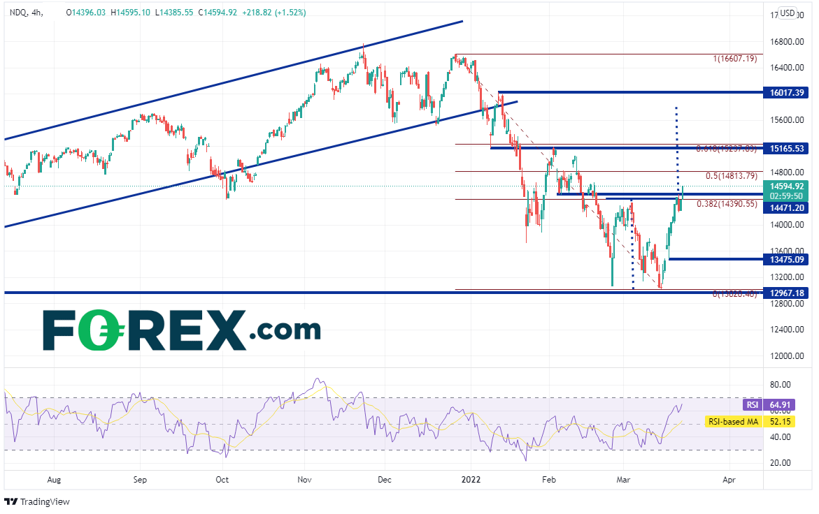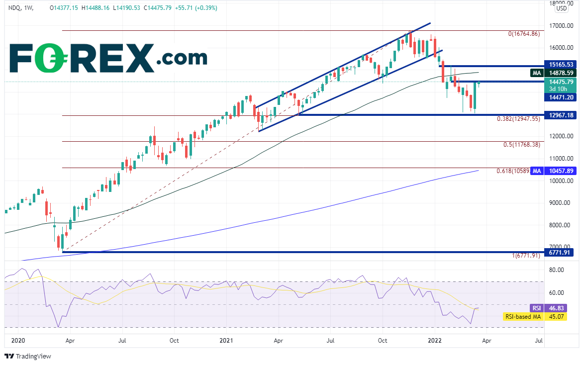 纳斯达克100指数自2020年3月低点强力反弹后回撤,技术面进入熊市但从周图看或许并非如此。请留意上档的阻力带,以及4小时图双底形态的目标,观察近期反弹是否可以延续。