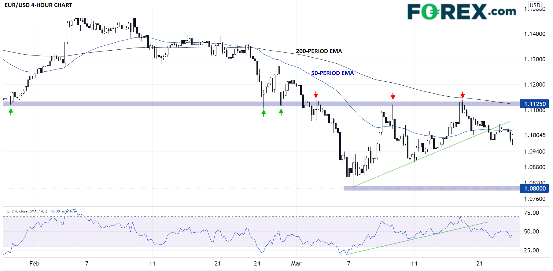在欧元/美元这个例子中,价格于月初击穿1.1125附近的支撑位,之后的下跌畅通无阻,最终跌至1.0800。欧元/美元在那之后回升并两次反击前支撑现阻力位1.1125,该位毫无悬念地构成阻力,导致价格在本周下破短线上涨趋势线(其本身也在本周的小级别反弹中发挥阻力作用)。