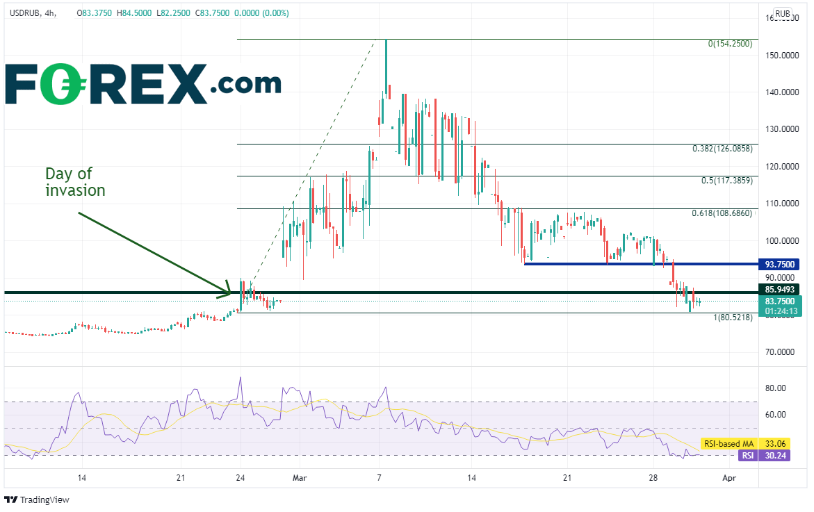 我们在3月初的讨论中指出,美元/卢布与部分东欧新兴市场货币对,比如美元/波兰兹罗提和美元/匈牙利福林之间有着高度相关性。过去2周美元/卢布和美元/波兰兹罗提4小时图相关性反复,但眼下相关系数达到+0.88。如果相关系数为+1.00,表明两种交易产品之间完美正相关,100%的时间里同向波动;如果系数超过+0.80,表明相关性高。美元/波兰兹罗提还没有完全触及入侵当天的突破位4.0505,其与当前价位构成水平支撑位,即4.1002。但请注意RSI业已进入30.00下方的超卖位,表明价格或准备回升。上方阻力在今天高点4.2020附近、水平阻力位4.2587、战争前创下的历史高点4.3078。