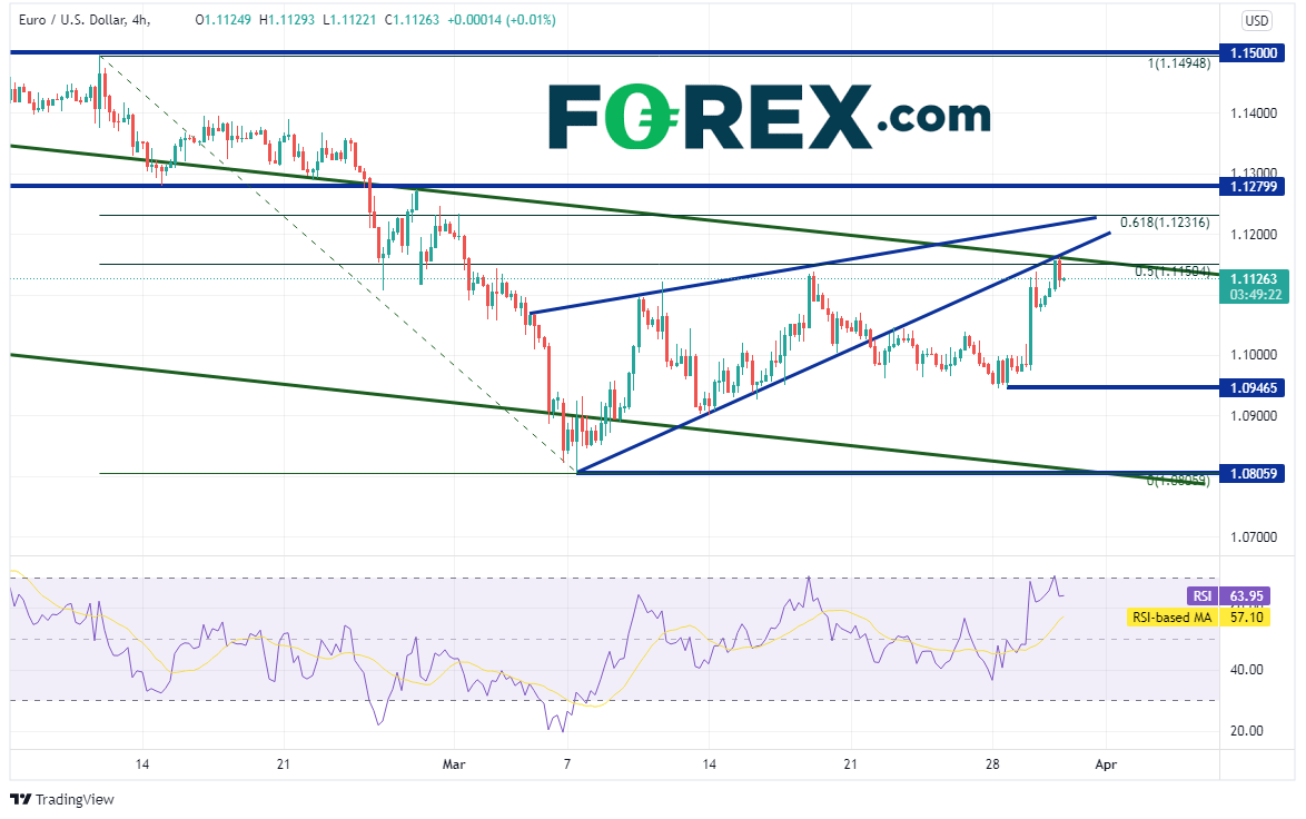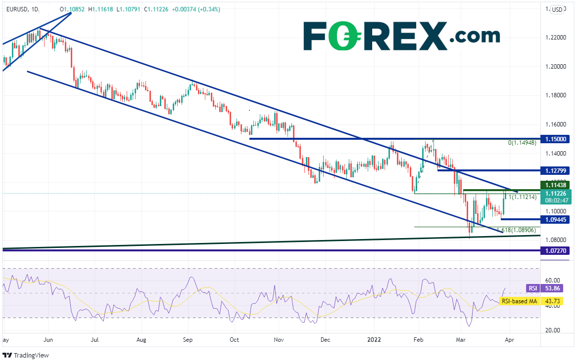 俄罗斯与乌克兰在土耳其举行和谈并取得积极进展,双方有可能停火。这样乐观的氛围昨天带动欧元/美元开始上涨,今天欧元区国家高于预期的通胀数据接力,推动其继续走高。该货币对目前攻击1.1143的阻力位,那也是2021年5月以来通道的上轨下降趋势线。欧元/美元3月曾多次对其发起进攻。