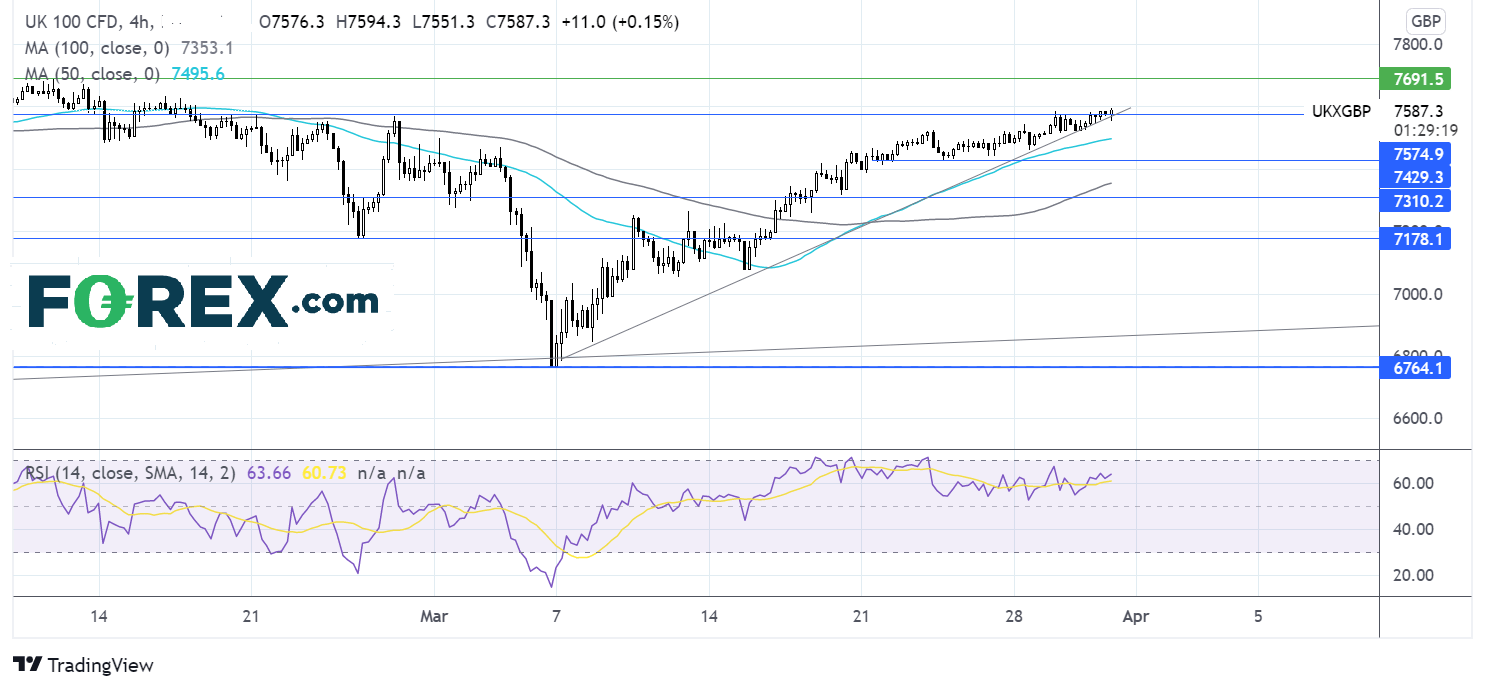 FTSE已将2022年低点6750以来的反弹扩大,目前交投于月初以来的上升趋势线并测试7580附近的阻力位,该位在过去半年里数次构成阻力。RSI留在超买区域之外,支持价格扩大上行。如果价格上破,可能上看疫情后期高点7690。