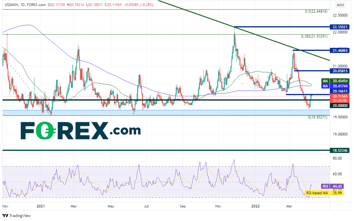 美元/墨西哥比索日图于2月底和3月初再次试图走高,但受制于长期下降趋势线所在的21.4687附近,此后一路滑坡,失守50和200天均线并下探长期支撑区域。