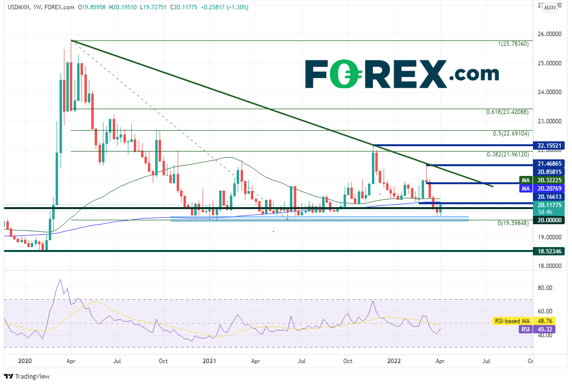 美元/墨西哥比索周图自从在2020年4月创下疫情高点25.7836以来一直走弱,形成下降三角形。请注意,在该三角形的底部筑有一个强支撑区域,即19.5491 - 19.7275区间。美元/墨西哥比索在2020年11月到2021年9月之间一直守住该区间,之后反弹至2020年4月高点到2021年6月低点行情的38.2%回档位,即21.9612附近,但未能收于其上,随后继续走低,目前又一次考验前述长期支撑区域。