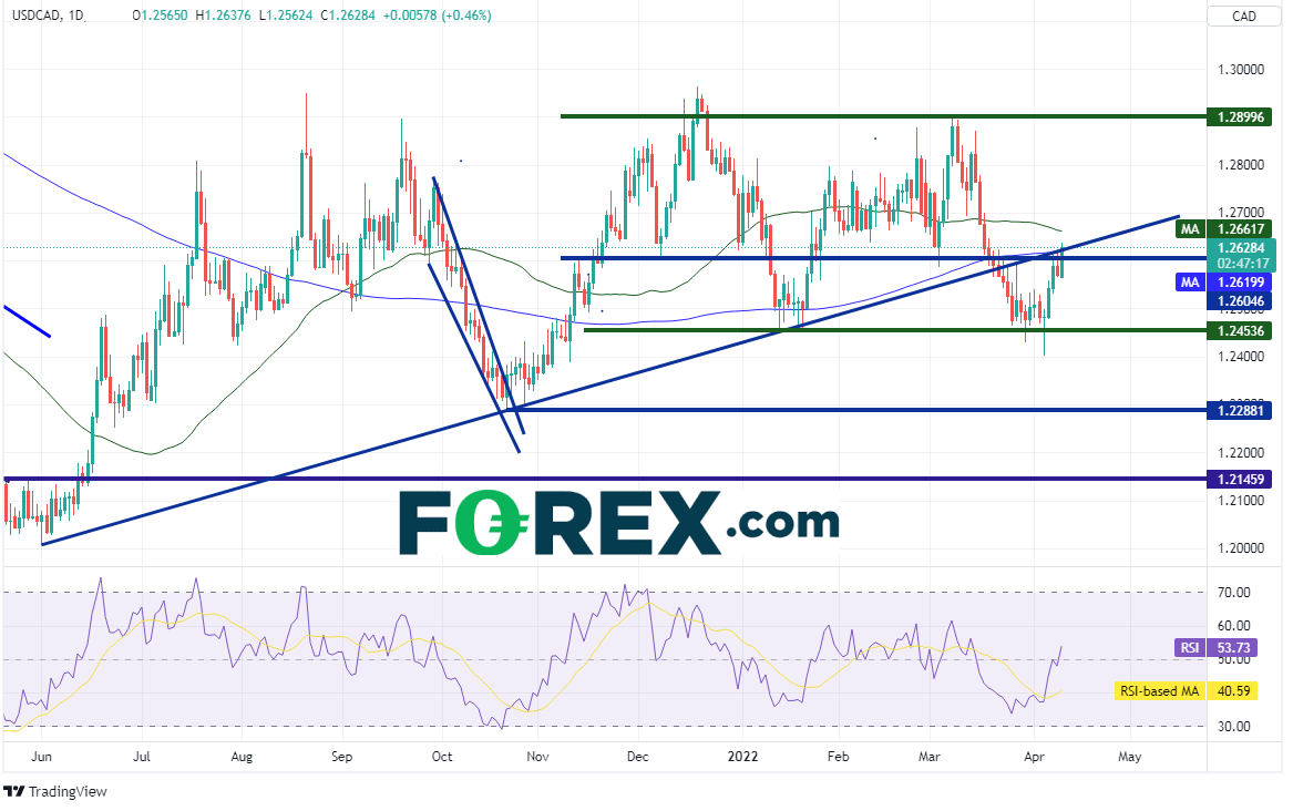 美元/加元自11月10日以来一直交投于1.2454-1.2900区间内,于4月5日考验区间下轨但以失败告终,日图上留下锤子形态,这是反转信号。该货币对此后一鼓作气上涨,今天构筑了看涨吞噬K线,期间攻克了水平阻力位、2021年6月1日以来上涨趋势线和200天均线1.2620附近。