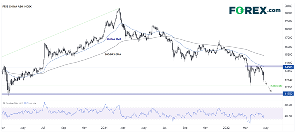如下图所示,该指数在去年2月最高站上20,000,此后不断下跌,上月触及2019年-2021年反弹行情的78.6%回档位附近,即12,400一线。在14,000下方盘整5周后,富时中国A50指数本周再度调头向下,可能很快回踩数年低点。
