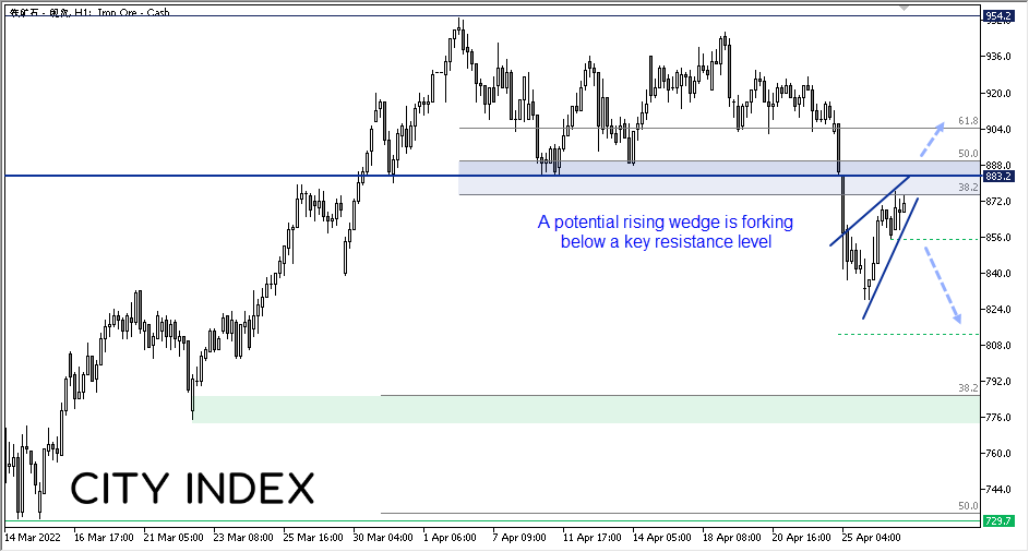 我们可以在铁矿石价格小时图上看到,昨天的高点落在38.2%回档位,就在883.2下方不远处。而昨天的反弹动能也弱于预期,表明看涨势能正在减弱。价格目前正于潜在上升楔形形态内向上盘整。