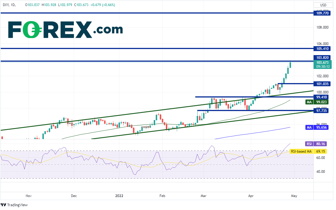 本月即将结束,美元指数日图呈现抛物线式走势,接下来直至105.41和2002年高点109.77才有阻力。第一支撑位也在较遥远的101.04,接着是4月21日低点和近期通道的上升趋势线99.82附近,然后是50天均线99.02。