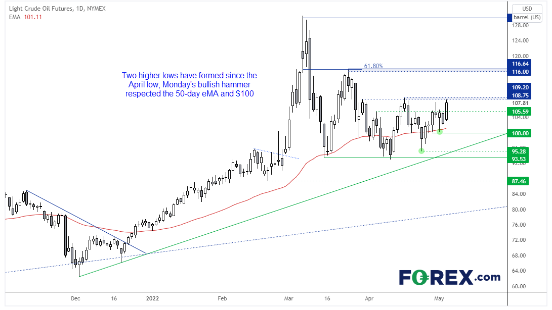 西得州原油似在蓄势突破109。自从3月在130附近筑顶以来,价格一直处于修正模式。但在93.50企稳后形成两个上抬的低点,透露出买需信号。周一的看涨锤子形态守住100天和50天指数移动均线构成的支撑,现在接近于测试108.75阻力位。如果站于其上,后市聚焦116。今天要想实现突破,前提是守住105 / 105.60支撑位。如果下破105,可能发出突破依然遥远的预警。