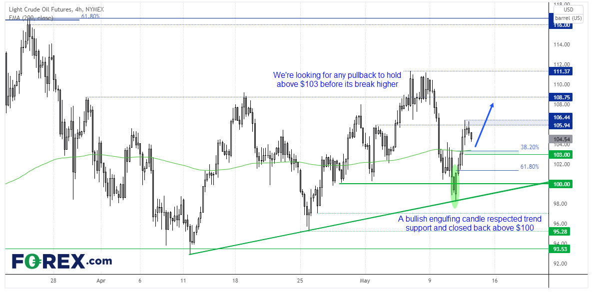 俄罗斯和欧洲之间地缘政治紧张局势推动能源价格昨日反弹,我们预计油价今天有望继续走高。昨天日线图构筑一条看涨吞没K线,此外4小时图上也有同样的看涨形态守住支撑,重回100美元上方。油价此后明确上破,攻向106美元区域,目前正就涨势回调。因此,我们现正等待当前回调能于103美元或其上方完成的迹象,该位置靠近200均线以及38.2%回档。