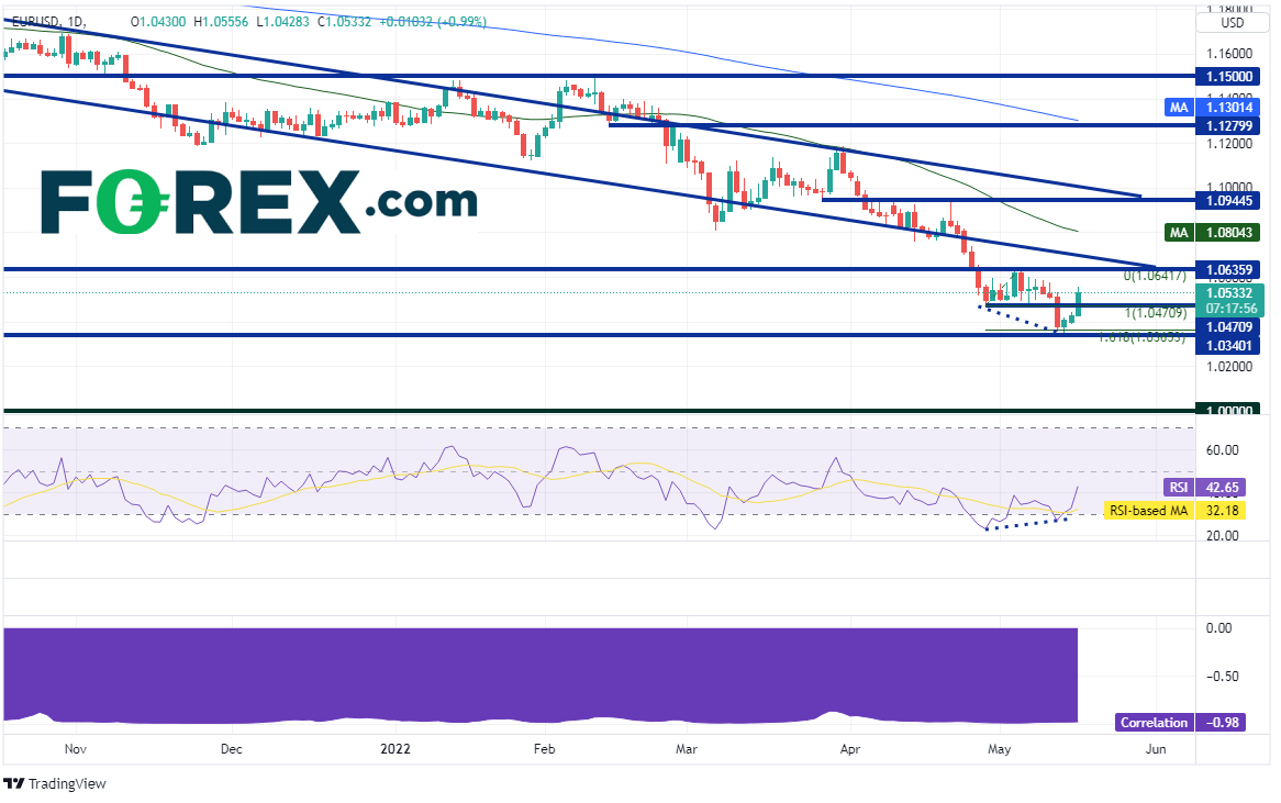 欧元/美元已下跌数月之久,当4月21日在日图高点1.0936形成射日之星形态时,下跌势头变得猛烈。但该货币对没有收于4月28日低点到5月5日低点行情的161.8%扩展位,即1.0365附近之下,也没有攻克2017年低点1.0340,其现为第一支撑位。如果下破,欧元/美元打开跌至平价(1.0000)心理整数关口的空间。阻力位在5月5日以来高点1.0642(与2020年月疫情低点1.0635相汇),然后是长期通道的下轨下降趋势线所在的1.0690附近,接着是50天均线1.0804。