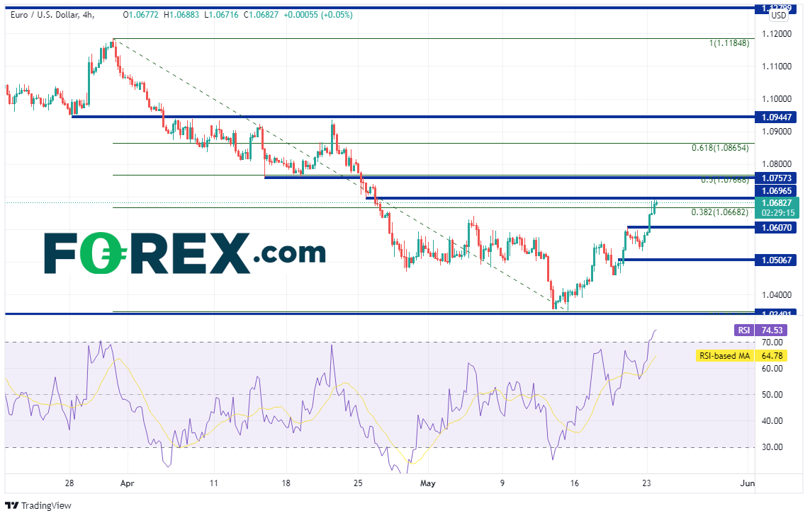 在拉加德奠定欧洲央行接下来加息基础的助力下,欧元/美元延续近期涨势。叠加好于预期的德国Ifo报告,欧元/美元当天反弹逾100点子。该货币对后市可以守住反弹之势吗?如果价格可以击穿1.0700并且4小时图RSI回落至中性区域,则存在这样的机会。