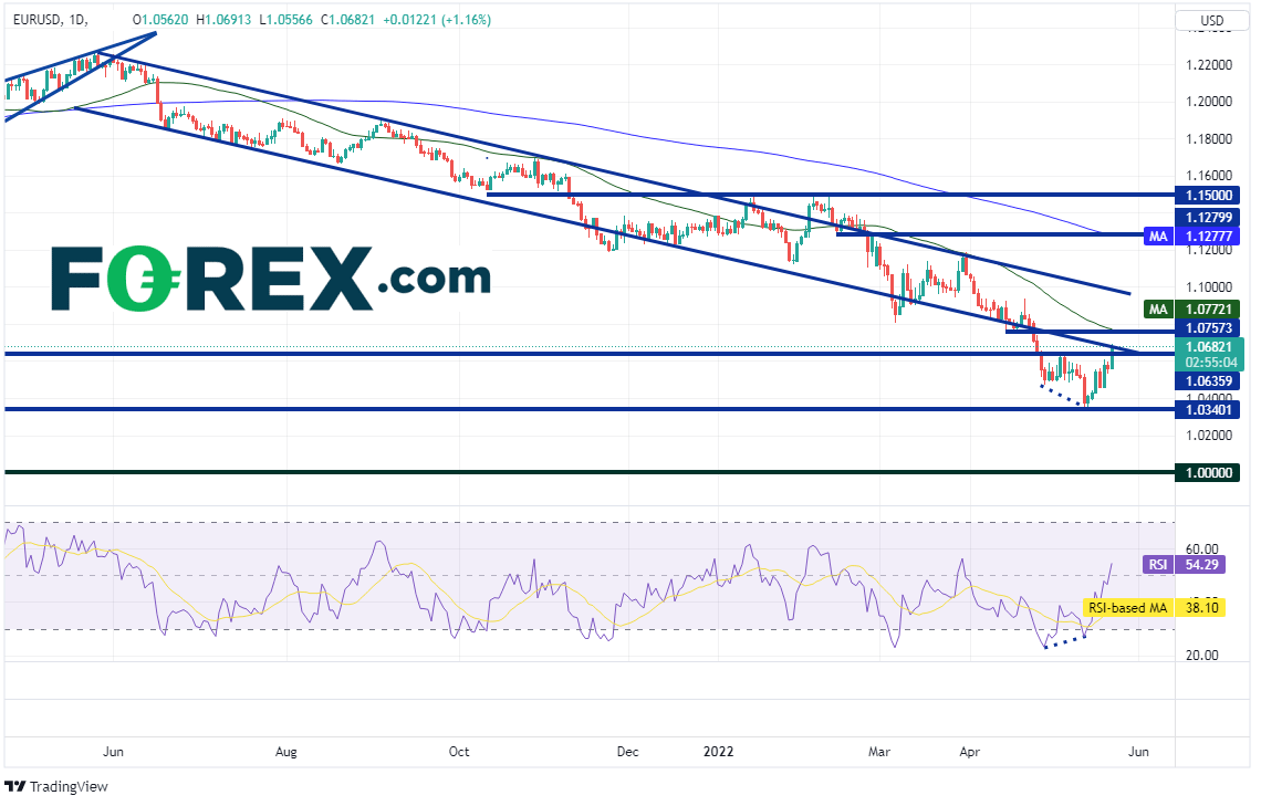 欧元/美元日图在2021年5月最高到达1.2262,此后有序下跌并形成通道。但在4月22日突然加大下行力度,下破通道的下轨趋势线所在的1.0753附近,5月13日跌至距离2017年低点1.0340不到9点子的位置。请注意,在欧元/美元考验2017年低点的同时,RSI与之背离,表明价格或准备回升。自那以后该货币对反弹,目前反击前述长期通道的下轨趋势线。