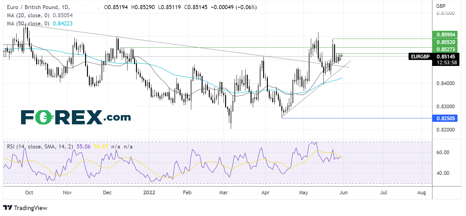 欧元/英镑自0.8480反弹后盘整于20期均线0.8505和0.8530之间。RSI高于50,表明价格或扩大上行。