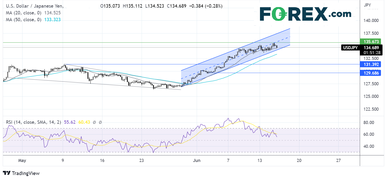美元/日元月初以来一直交投于上升通道内,隔夜创下23年高点135.50,之后回落。