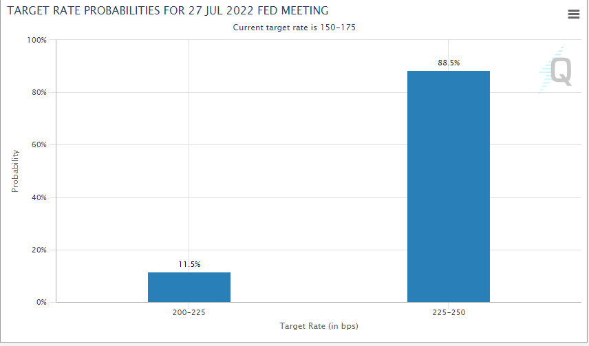 CME的Fedwatch工具显示,市场目前计入美联储7月会议加息75个基点的几率为88.5%,届时基准利率可能升至2.50%.