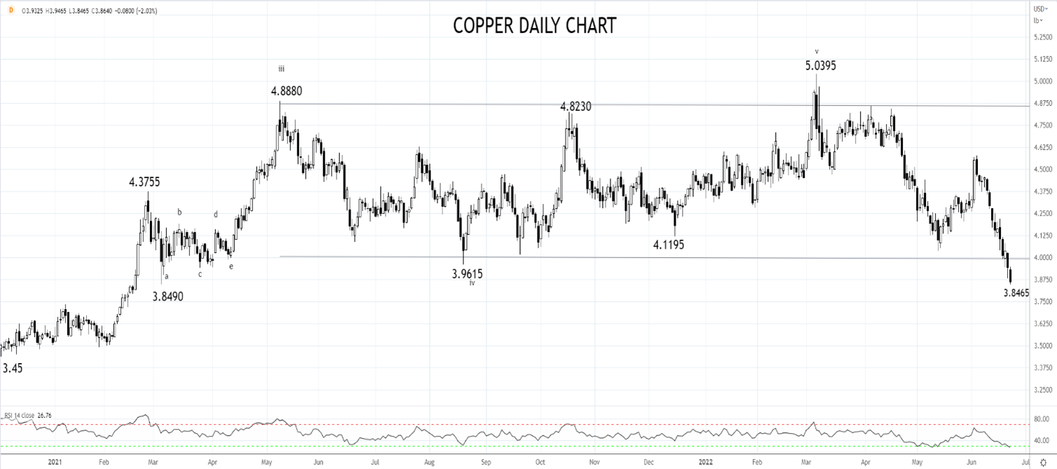 如下图所示,今天亚盘,铜价延续下破趋势。如果铜价保持阻力位4.00美元/ 4.15美元(前支撑位)下方,则可能继续回落至周线图支撑位3.50美元。