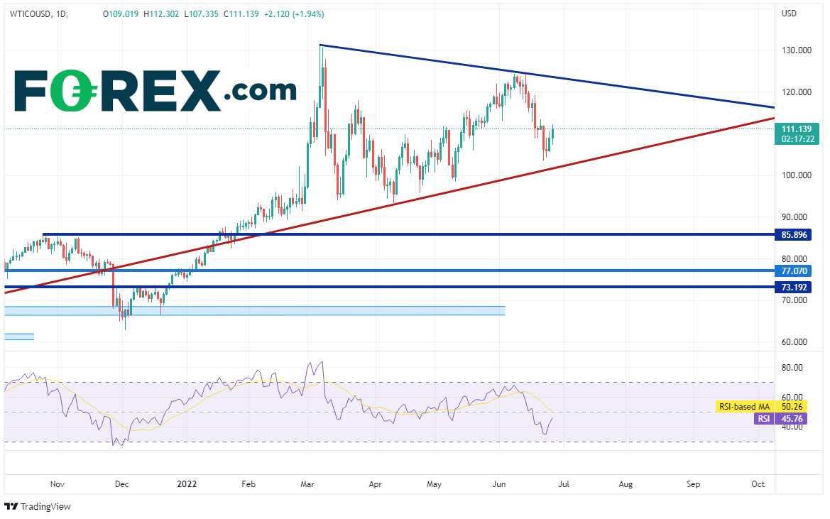 西得州原油4小时图回调至6月14日高点到6月22日低点行情的38.2%回档位,即111.52附近,上档阻力有6月21日以来高点113.40、前述行情分别落在113.99和116.46的50%和61.8%回档位。如果市场出现增产预期并导致油价下跌,则下档支撑位先后有周一低点107.33附近、6月22日低点103.53以及对称三角形的下轨上升趋势线(请看下图红色线)102.00附近。