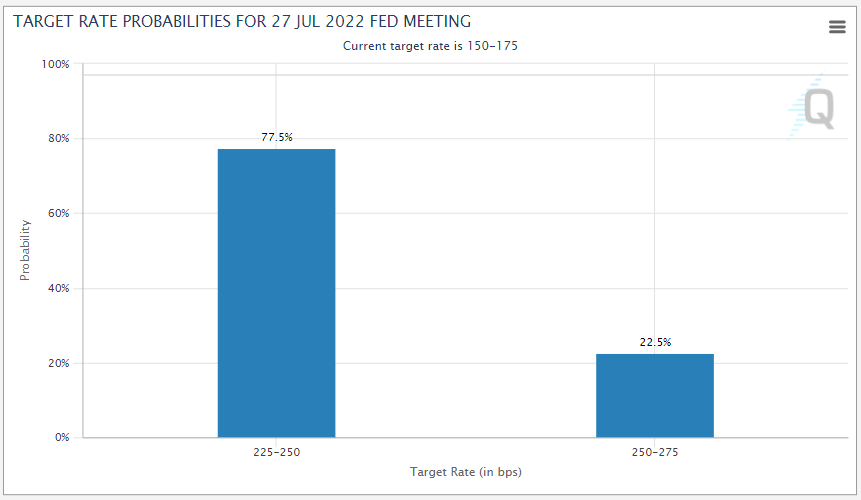 从CME的FedWatch工具判断,交易者目前计入加息75个基点的几率为四分之三左右,加息100个基点的几率为23%左右。