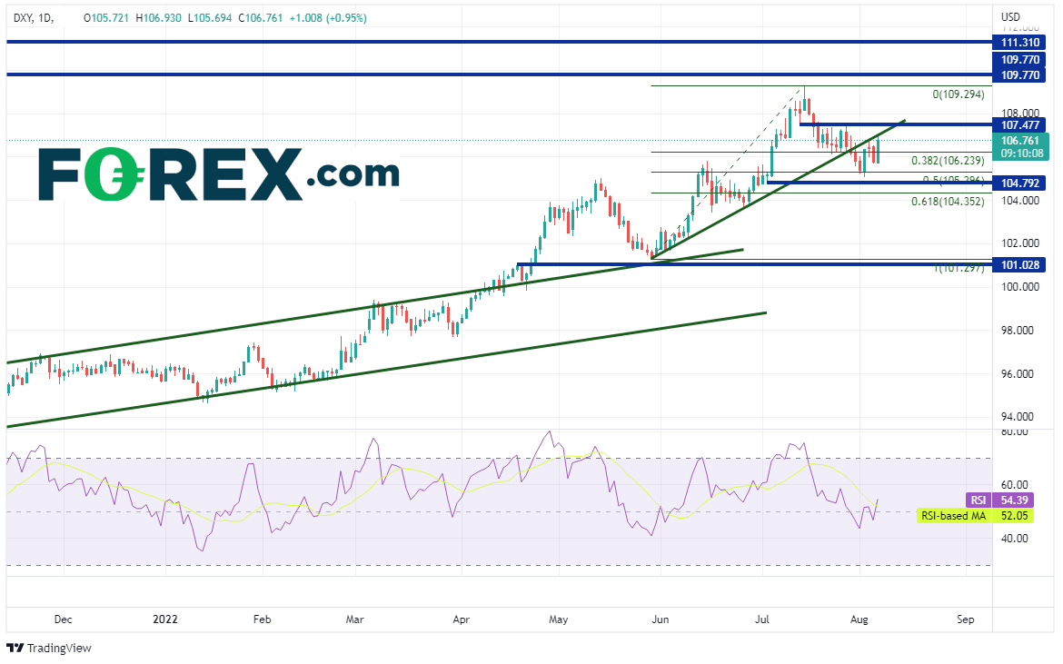 美元指数日图从20215月开始不断上涨,美联储将加快升息步伐的事实越来越清晰,助其在414日站上通道后强力上行。美元指数于714日创下数年高点后回落至530日低点到714日高点行情的50%回档位,即105.30附近,目前逼近上升趋势线107.00附近,如果可以站于其上,可能先后上看水平阻力位107.48714日高点109.29。如果收上106.51,则上周五的K线将成为看涨吞噬K线,预示后市扩大上行。如果受制于阻力位,第一步可能下看82日低点105.05附近,然后下探104.79支撑位,再跌至前述行情的61.8%回档位。