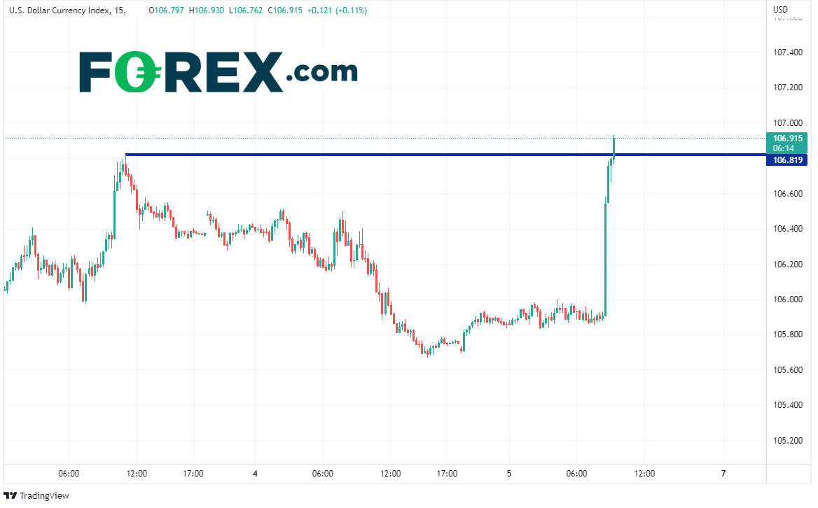 美元闻讯起飞。在美联储将继续积极加息的观点作用下,美元指数大举冲高,击穿了83日高点106.82