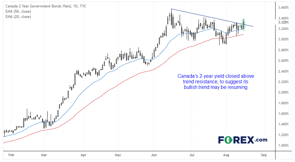 加拿大2年期政府债券收益率收上了趋势线阻力,具备了反击并突破至新高的基础。该收益率对货币政策更加敏感,更得交易者的关注。2年期收益率已在50天指数移动均线处企稳并形成看涨锤子形态,而昨天的低点止步于20天指数移动均线,表明上涨动能增强。这点或利多加元后市。