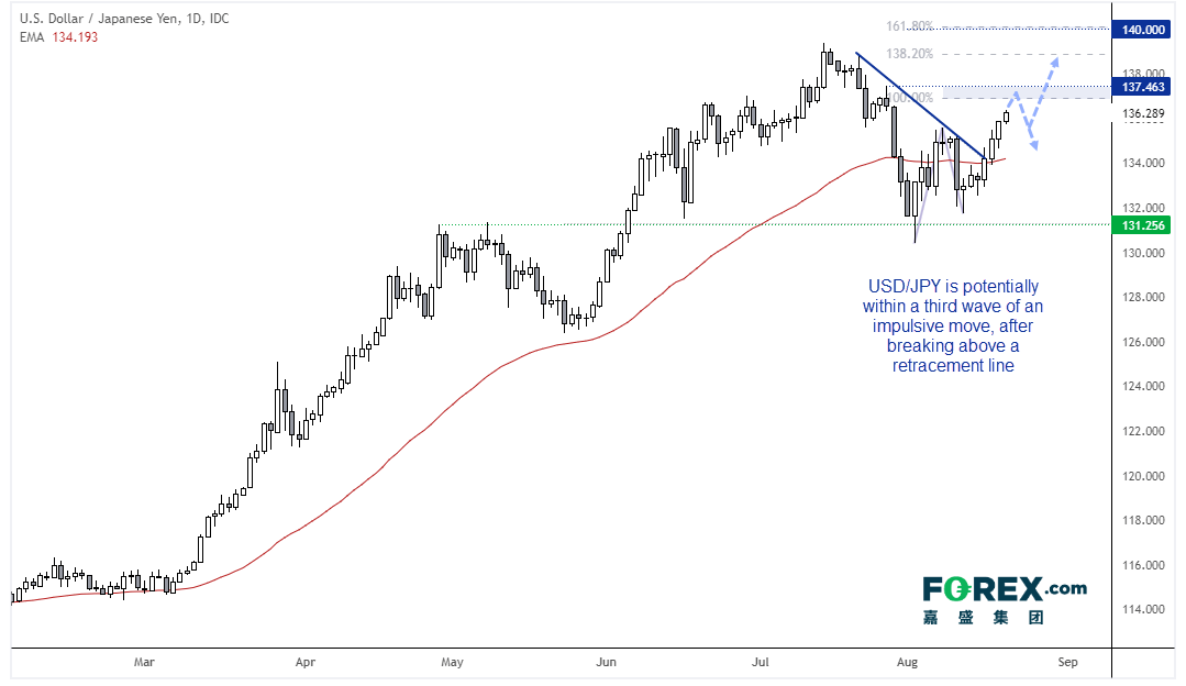美元/日元日图仍处于上涨趋势中,最近站上了回档线,表明已重拾反弹行情。月初形成一个上抬的低点,现在可能处于第三浪推动浪。时间周期较低级别上的趋势结构同样看涨,价格有可能上攻137.46高点。我们留意在关键阻力区域,即138.2% 161.8%扩展位,回撤的风险。如果站上137.46高点,可能上看140整数关口下方不远处的前述价位。