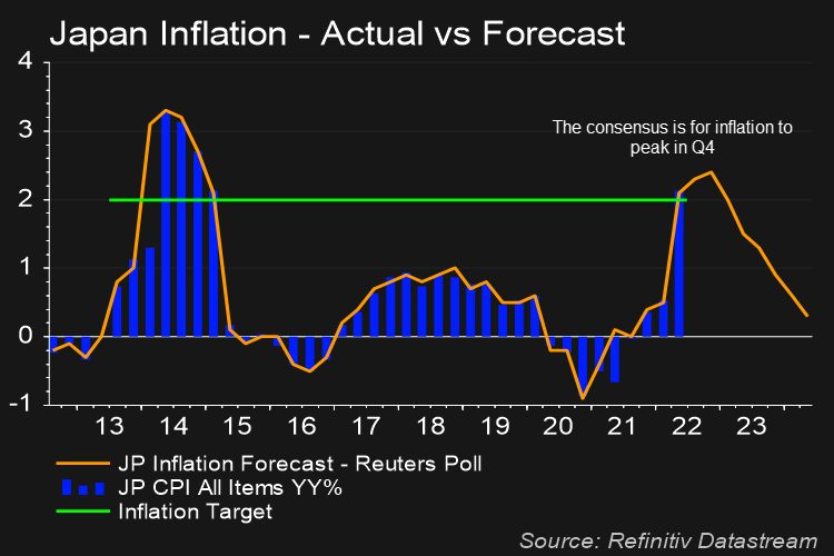 从日本央行超级宽松的政策判断,尽管物价压力日增,央行完全没有可能加息或调整收益率曲线控制政策。债券交易者在今年6月曾试图驱使日本央行调整其收益率曲线控制政策,招致央行购买天量债券的回击。交易者以受伤收场,而央行成功收复对其10年期债券收益率的控制权。日本通胀仍在升温,但程度弱于其它发达国家,也处于日本央行自己的预测值的合理偏差内。事实上,根据日本央行的预测,通胀会在四季度达到顶峰。所以,整体上似乎没有理由预期日本央行迫切调整利率或收益率曲线控制政策。