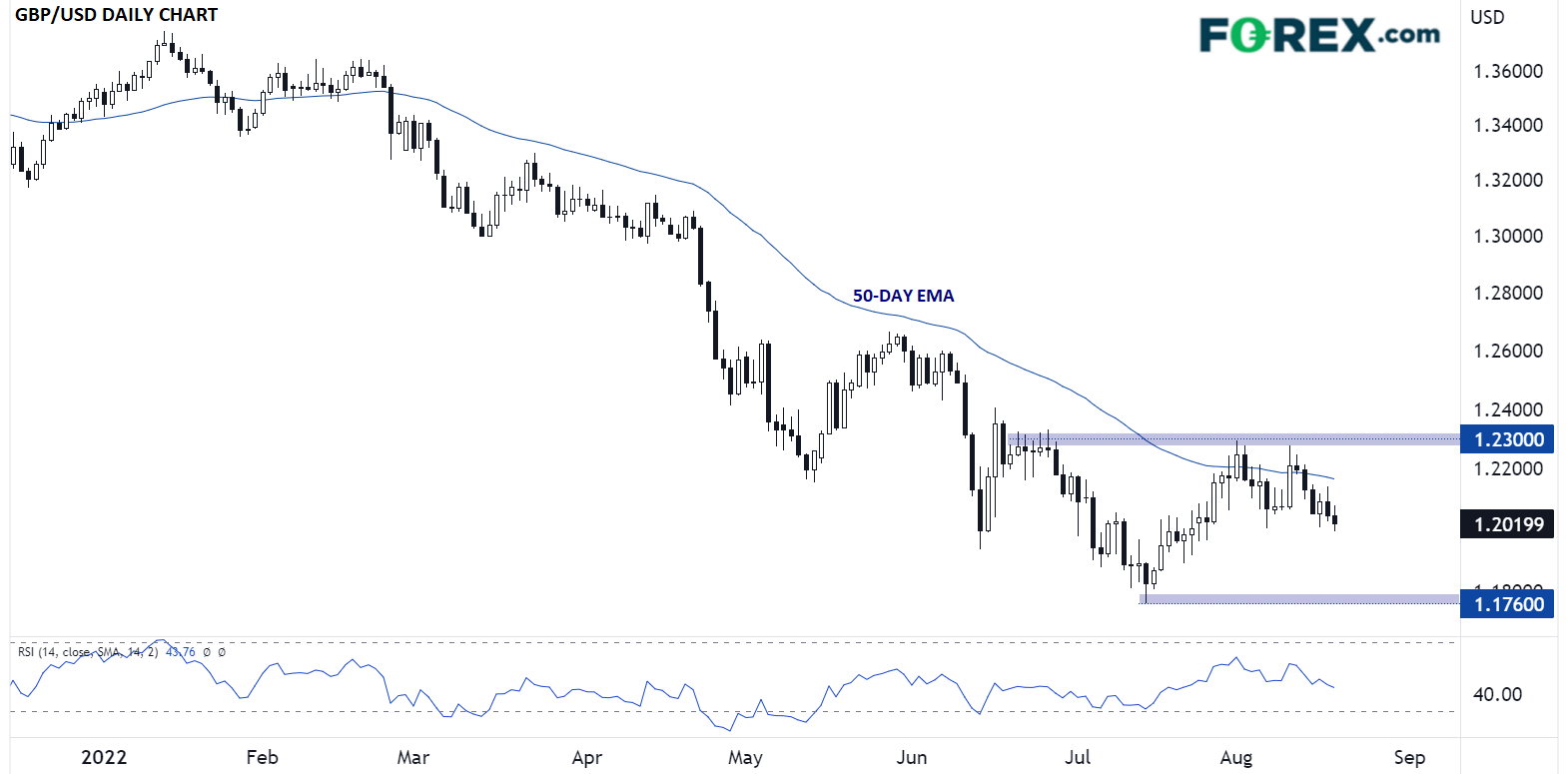 如下图所示,英镑/美元年初以来一直处于边界清晰的下跌趋势中。反弹在月初止步于50天指数移动均线,此文发稿时英镑/美元已朝1.20整数位回落。要想缓解这种下跌势头,需要有效站上1.23区域的2个月高点,或许可以得到Truss下月获胜的助力。