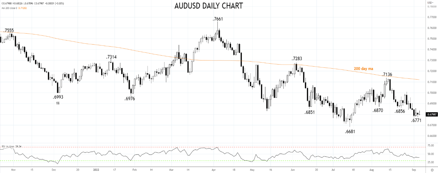 澳元/美元过去几个交易时段一直受制于0.6850/70的阻力区域,要缓解从8月中旬高点0.7136以来4.75%的下跌势头,需要站于其上。