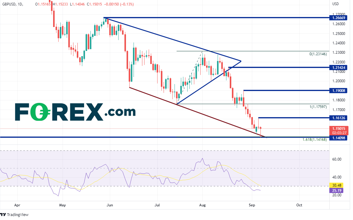 英镑/美元周图跌破20203月以来低点1.1411附近,上次下破还是在1985年,当时最低触及1.0520。但请注意,RSI随着价格创下三个下降的低点而形成三个上抬的低点。这通常暗示价格可能反转。