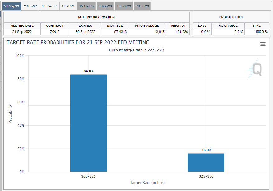 美国8CPI年率从8.5%下降至8.3%,高于8.1%的预期值。但核心CPI才是交易员讨论的重点,其8月年率从5.9%上升至6.3%,高于6.1%的预期值。核心读数剔除了食品与能源价格,所以今天的读数可能表明,通胀不仅限于不稳定的食品与能源价格中。也就是说,通胀已渗透到美国经济的方方面面,波及整体商品与服务的价格。而通胀深入并盘踞于经济中正是美联储一直以来的深重忧虑。前述数据发布之后,根据CMEFedWatch工具,市场不仅计入84%的几率下周加息75个基点,还计入16%的几率加息100个基点