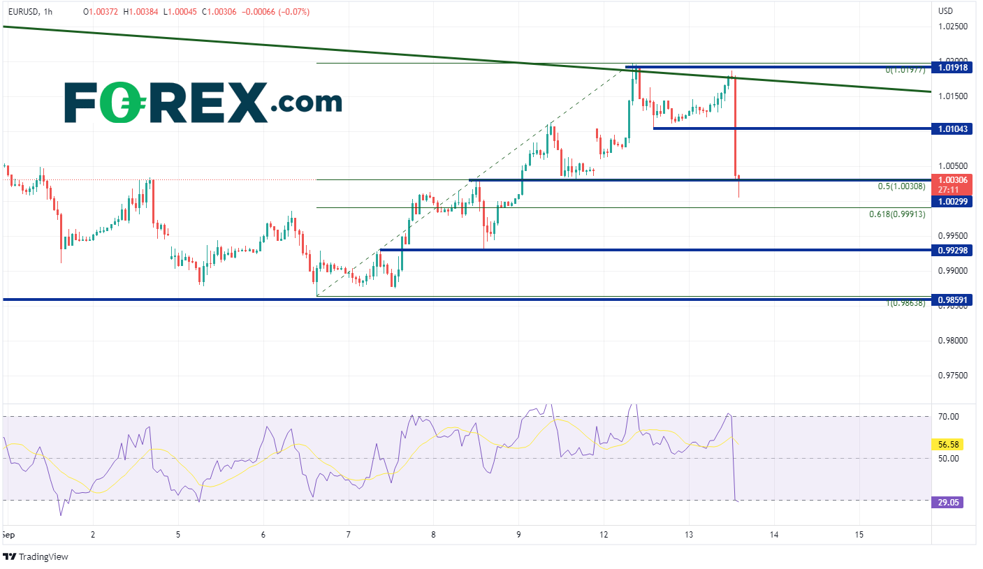受高于预期的CPI数据的推动,美元暴力跃升。欧元/美元小时图此前一直交投于长期下降通道的上轨趋势线(请看图中绿色线)附近,即1.0200下方。CPI数据甫一发布,价格旋即下破96日低点到912日高点行情的50%回档位,即1.0031附近。短线支撑在前述行情的61.8%回档位、水平支撑位0.993096日低点0.9859。盘中阻力位先后在1.0104和近期高点与通道上轨趋势线1.1098