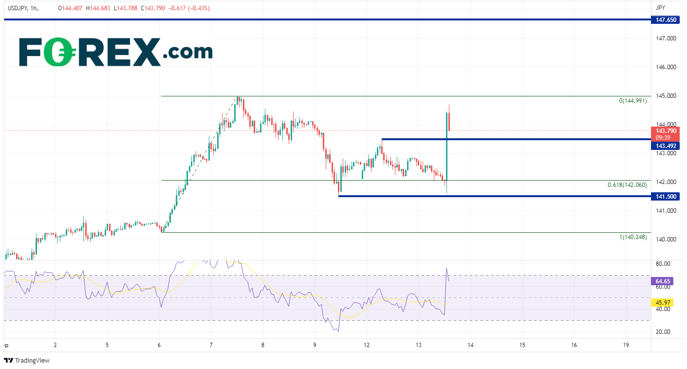 CPI数据发布引起的美元货币对的暴力走势中,最引人瞩目的货币对是美元/日元。此前价格一直交投于96日低点到97日高点行情的61.8%回档位,即142附近。数据甫一发布,价格旋即冲高至144.68,斩获近270点子的涨幅。请注意,短线图表上RSI马上进入了超买区域,预计日内价格回撤(目前已回调近90点子)。下方盘中支撑位有水平支撑位143.49、今天低点141.59附近。上档阻力先后有97日高点144.991998年高点147.65