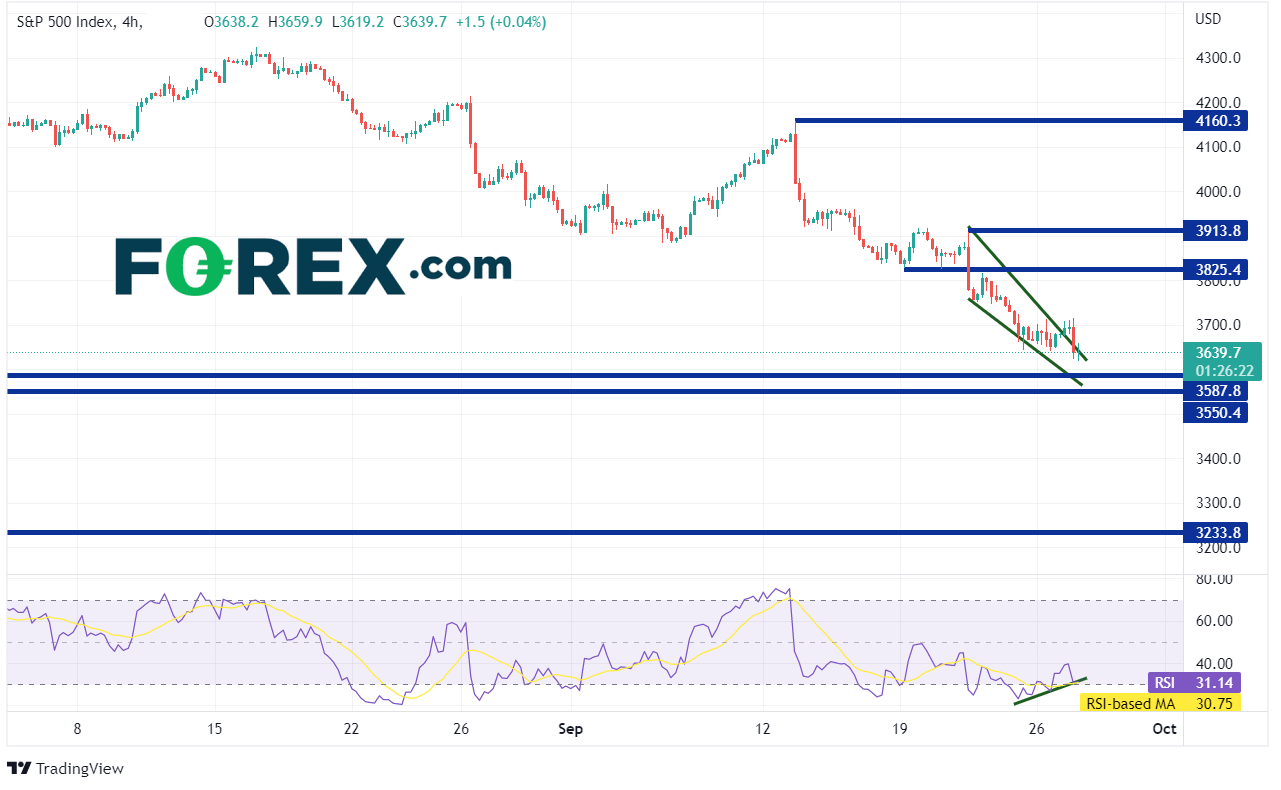 从当前走势打破了下降楔形判断,股市应可反弹。请注意,4小时图RSI正与价格背离。如果价格确实自当前价位回升,则上方阻力先后有水平阻力位3825.4、下降楔形的100%回档位兼921日高点3913.8913日以来高点4160.3。但如果价格继续下跌,则下方支撑位有20209月高点3587.8202010月以来高点3550.4202011月低点3233.8附近。