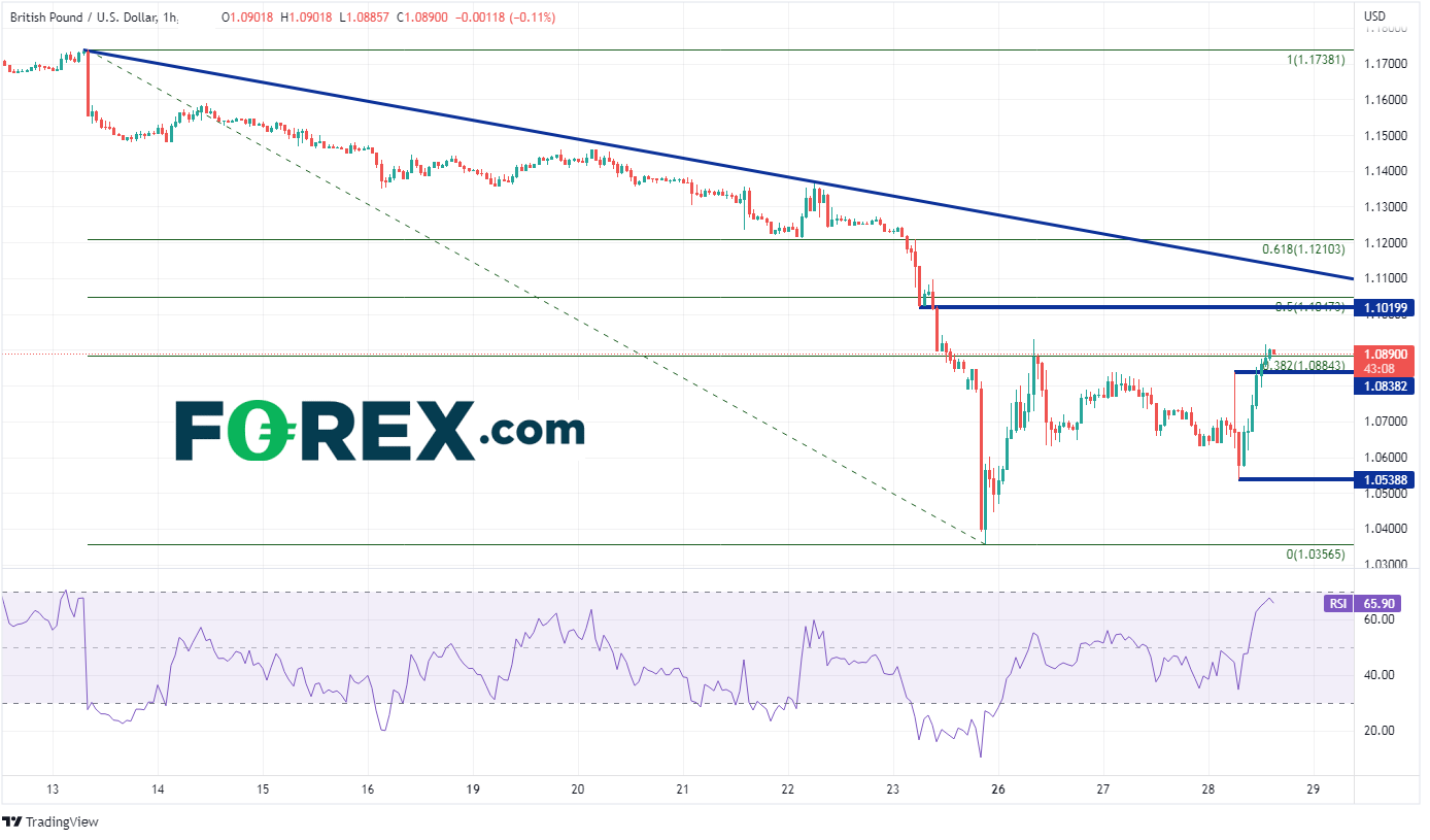 正如我的同事Fawad Razaqzada所述,英国央行的这次干预从长期来看或许不利于英镑。但正如今天动态所示,英国央行或在短期内拯救了英镑。如果英镑/美元继续上涨,上方阻力先后有水平阻力位1.1020附近、上述行情的50%回档位1.1047附近、913日高点以来的下降趋势线1.1135附近。下档支撑先后有英国央行宣布干预后出现的上影线高点1.0838、今天低点1.0539、历史低点1.0357