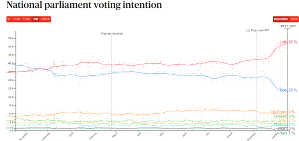 另外一份关于目前政党受欢迎度的民调显示,反对党工党(52%)大幅领先保守党(23%30个百分点。这意味着如果今天举行大选,保守党可能面临溃败。英国下届选举预计在2024年举行。