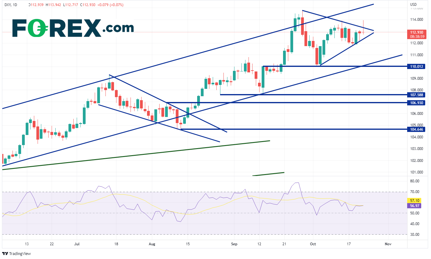 美元指数(DXY)和其他相对货币以及国债收益率走势快速反转。美元指数自高值113.94上升101点子,随后日内回落至112.94附近。值得注意的是,美元指数指数在上述消息传出后,突破三角旗形态。如果今日保持倒锤形态,则可能是假突破,价格或会测试周三形成的低点111.91