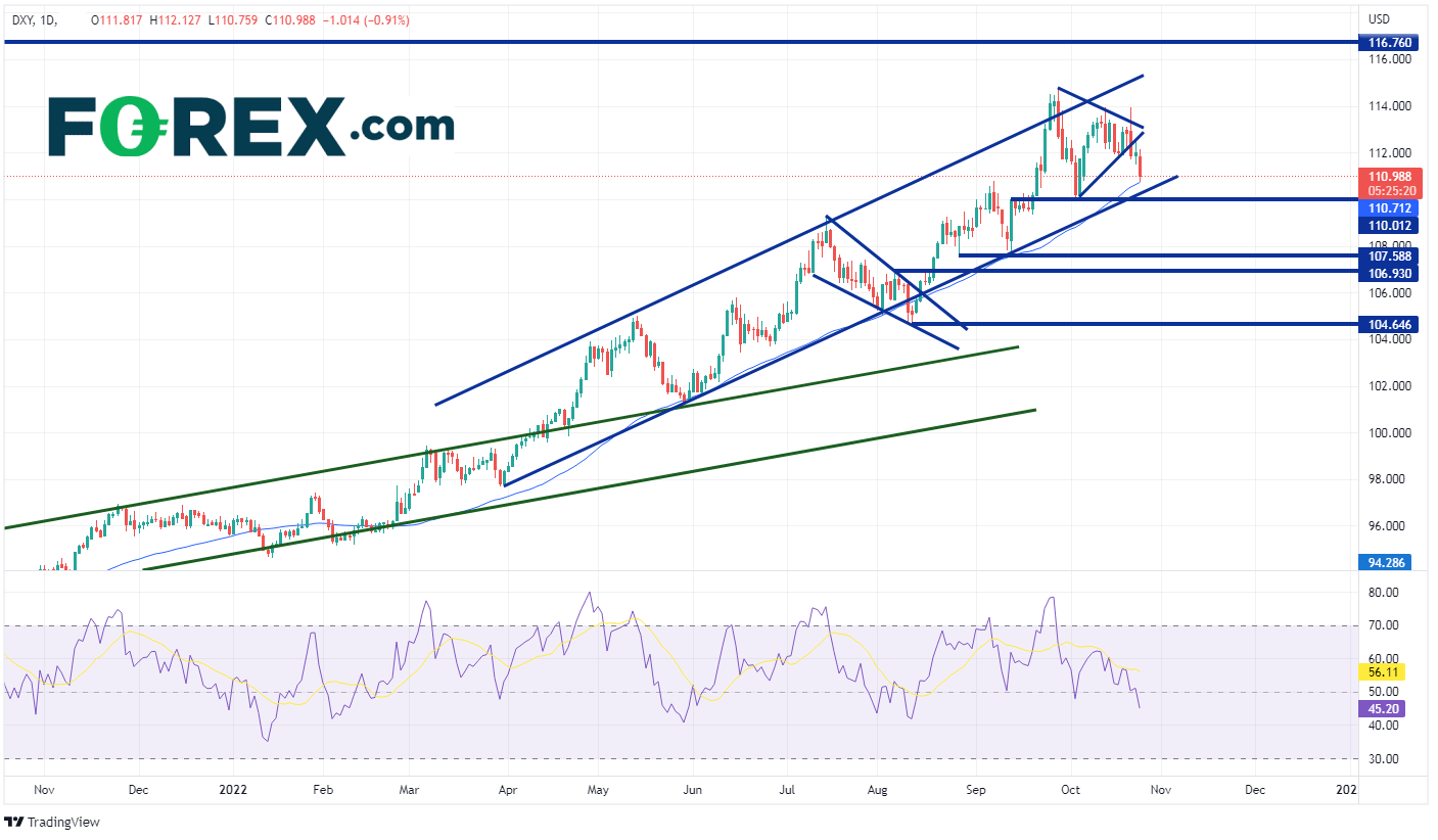 美元指数在四月初时仍不足100,之后进入急速上升通道。926日,指数假突破冲出通道,上探高点114.78,随后回撤落回通道内。自此,指数价格在通道中的对称三角形形态内盘整。然而在1021日,日本央行疑干预外汇市场,抛售美元并买入日圆,而美元指数再度假突破冲出三角形态,随后遭抛压,最终收盘价位于三角形顶点下方。本周周一和周二,美元指数继续走低,目前在200天移动平均线110.71附近试探。