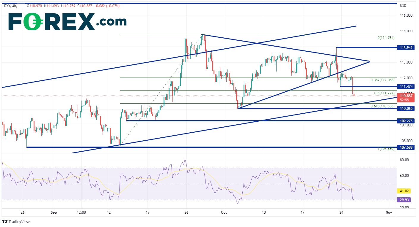 4小时图来看,正如上文所述,美元指数正在测试200天移动平均线(见日线图),突破913日低点至928日高点的50%回档位,落在111.22。如果价格持续走低,长期通道下轨将与61.8%回档位将在110.39附近交汇,形成第一个支撑位区间,下一支撑位则在104日低点110.07。第三个支撑位则落在914日低点109.28。然而,如果美元指数坚挺并继续攀升,则第一个阻力位将在1024日低点111.41形成。继续向上,指数可能分别向对称三角形两条轨线上的112.70113.25波动,然后上探113.941021日高点)。